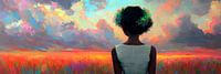Schilderij - Schilderij met bloemen. Panorama uitzicht meisje met bloemen. Impressionisme portret schilderij van vrouw bij een uitzicht op een landschap.