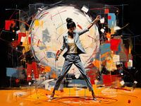 Dit schilderij spat van het doek met intense expressie. Abstracte symbolen, felle kleuren en krachtige lijnen vormen een levendige chaos van emotie. Zijn kenmerkende kroontjes en gestileerde teksten versmelten tot een unieke visuele taal. Het werk lijkt een spontane eruptie van creativiteit, een poëtische dans tussen chaos en orde, typerend voor Rebelse kunstenaar unieke stijl.