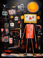 Dit schilderij spat van het doek met intense expressie. Abstracte symbolen, felle kleuren en krachtige lijnen vormen een levendige chaos van emotie. Zijn kenmerkende kroontjes en gestileerde teksten versmelten tot een unieke visuele taal. Het werk lijkt een spontane eruptie van creativiteit, een poëtische dans tussen chaos en orde, typerend voor Rebelse kunstenaar unieke stijl.