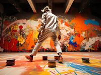Dit schilderij spat van het doek met intense expressie. Abstracte symbolen, felle kleuren en krachtige lijnen vormen een levendige chaos van emotie. Zijn kenmerkende kroontjes en gestileerde teksten versmelten tot een unieke visuele taal. Het werk lijkt een spontane eruptie van creativiteit, een poëtische dans tussen chaos en orde, typerend voor Rebelse kunstenaar unieke stijl.