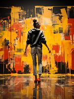 Dit schilderij spat van het doek met intense expressie. Abstracte symbolen, felle kleuren en krachtige lijnen vormen een levendige chaos van emotie. Zijn kenmerkende kroontjes en gestileerde teksten versmelten tot een unieke visuele taal. Het werk lijkt een spontane eruptie van creativiteit, een poëtische dans tussen chaos en orde, typerend voor Rebelse kunstenaar unieke stijl.