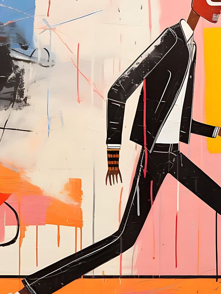 Dit schilderij spat van het doek met intense expressie. Abstracte symbolen, felle kleuren en krachtige lijnen vormen een levendige chaos van emotie. Zijn kenmerkende kroontjes en gestileerde teksten versmelten tot een unieke visuele taal. Het werk lijkt een spontane eruptie van creativiteit, een poëtische dans tussen chaos en orde, typerend voor Rebelse kunstenaar unieke stijl.