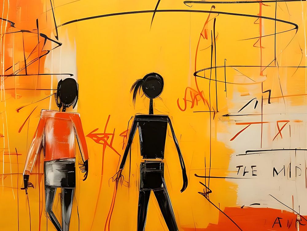 Een schilderij spat van het doek met intense expressie. Abstracte symbolen, felle kleuren en krachtige lijnen vormen een levendige chaos van emotie. Zijn kenmerkende kroontjes en gestileerde teksten versmelten tot een unieke visuele taal. Het werk lijkt een spontane eruptie van creativiteit, een poëtische dans tussen chaos en orde, typerend voor rebelse kunstenaar unieke stijl.