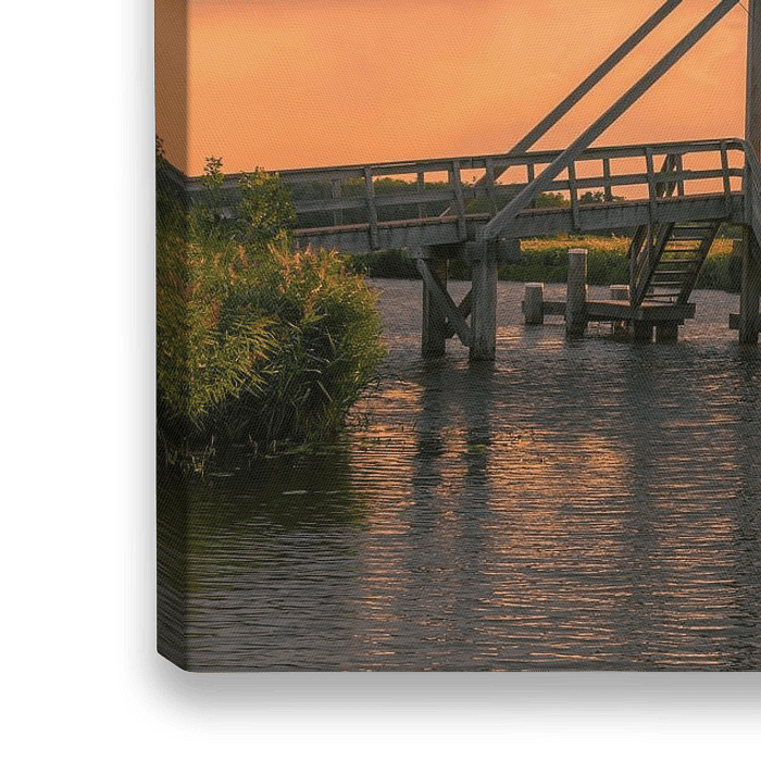 Houten voetgangers brug Schildjer Tilbat over het Afwateringskanaal van Duurswold ten zuidwesten van het Schildmeer, tijdens zonsondergang. Gelegen in de provincie Groningen, Nederland.