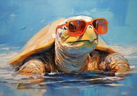 Schildpad met Zonnebril | Schildpad Canvas Art - Dit speelse schilderij toont een zeeschildpad met een zonnebril, zwevend op een lichtblauwe zee achtergrond. De expressieve penseelstreken en het gebruik van kleur geven het stuk een levendige, bijna humoristische uitstraling waarbij vooral het contrast tussen het blauw van de zee en de…