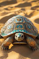 Dit ontwerp toont een prachtige schildpad die sierlijk over het warme woestijnzand loopt, met een uniek patroon op zijn schild. De schildpad is niet zomaar een gewone; zijn schild is met buitengewone details versierd in prachtige tinten blauw, goud en turquoise. Het geometrische ontwerp en de rijke kleuren geven de schildpad een bijna…
