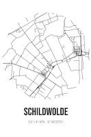 Zwart-witte landkaart, stratenplan of plattegrond van Schildwolde. Schildwolde is gelegen in de gemeente Midden-Groningen, provincie Groningen. Op de stadskaart zijn alle openbare wegen in Schildwolde opgenomen. Verder is de kaart voorzien van de coördinaten van het centrum van Schildwolde.