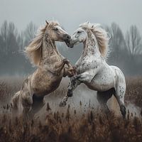 Twee jonge paarden paarden, allebei schimmels, dartelen met speelse gratie, hun witte vachten contrasterend met  het landschap.
