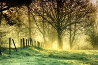 Voor de mooiste foto's moet je voor dag en dauw op. Hier ontdooit de vorst bij de eerste zonnestralen. De zon komt op achter het bos.