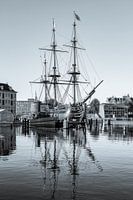 Zwart-witfoto replica van het schip Amsterdam uit 1749, een Oost-Indiëvaarder, een koopvaardijschip, in het Scheepvaartmuseum, Maritiem Museum, in het havengebied van Amsterdam, Nederland.
