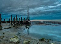 Schip in de haven op drooggevallen wad. Dreigende wolken boven het wad met het scheip veilig in de haven.