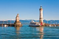 Beierse leeuw en vuurtoren in de haven van Lindau, Beieren, Duitsland.