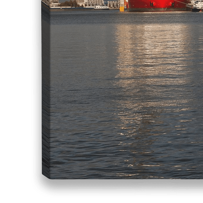 Een groot schip in de Rotterdamse haven wordt geladen en gelost. Op de voorgrond een grote meerpaal. Op de achtergrond zijn de contouren van de Wilhelminapier te zien met Montevideo, New Orleans, Port of Rotterdam en de Euromast.