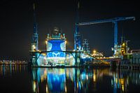 Offshore schip Hermit Viking in het dok bij scheepswerf Niestern Sander in Delfzijl. Foto is genomen op een windstille nacht en het verlichte dok geeft een mooie reflectie in het gladde water.