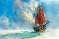 Schip met Rode Zeilen - Romantisch Schilderij van Peter Pen tekeningen en schilderijen