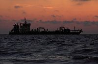 Dit schip passeerde de kust van Westkapelle over de noord zee terwijl er een mooie zonsondergang op de achtergrond te zien was. De lucht kleurde rood en oranje en de zon was inmiddels in de zee gezakt.
