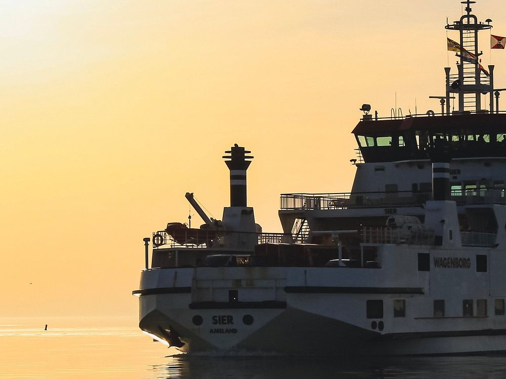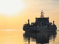 Dit beeld is gemaakt op Texel, waar een schip langzaam over het water vaart terwijl de zon ondergaat. De gouden gloed van de avondzon en de spiegeling in het water creëren een kalme, bijna dromerige sfeer.