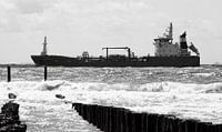 Dit grote schip passeerde de kust van Zoutelande op korte afstand,het verbaasde me dat hij zo'n korte afstand de golfbreker voorbij kon varen.Hier zorgt de golfbreker ook weer voor een mooie lijn die naar het schip leidt.Beeld omgezet naar zwart/wit.