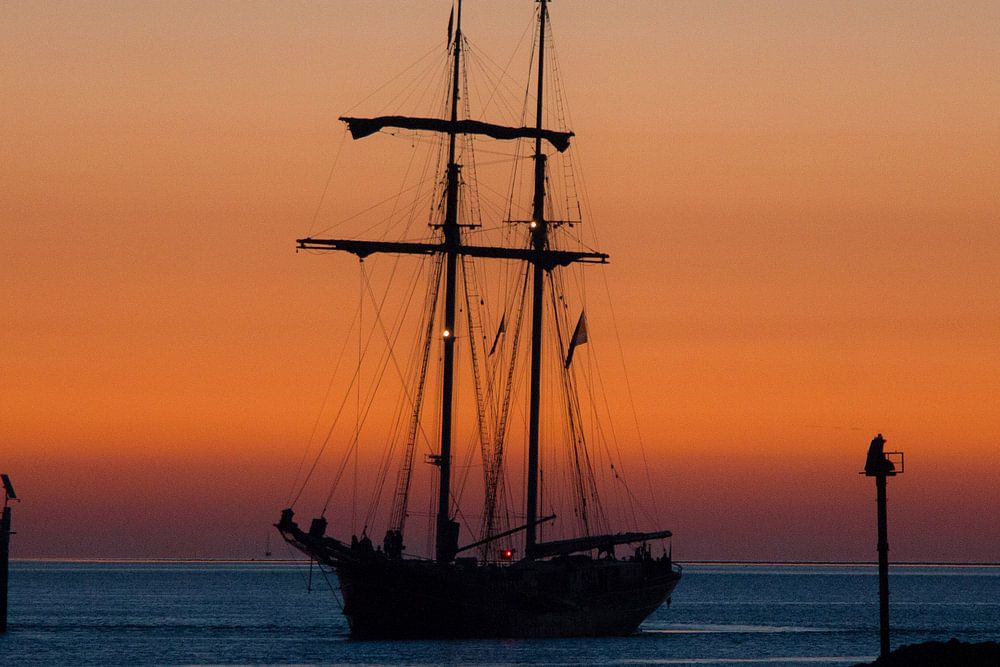 Dit schip vaart de haven van Harlingen binnen tijdens zonsondergang. Een prachtig silhouette tegen de warme kleuren in de lucht van de zonsondergang.