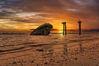 Op het Elbe-strand in Hamburg ligt het wrak van de oude schuit "Uwe" en wordt bij eb bijna volledig zichtbaar.