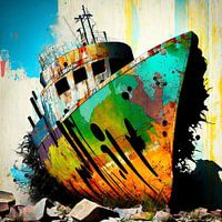 Een gestrand schip, een skeletromp, wordt ondergedompeld in een caleidoscoop van vervagende kleuren. Turquoise blauw, roestrood en zonnig geel vechten om de dominantie op de haveloze metalen platen, bedekt met dynamische zwarte penseelstreken die tegelijkertijd verval en beweging suggereren. De romp is doorboord en onthult het interieur, dat getekend is door de elementen. Puin stapelt zich op rond het schip en schaars groen houdt zich vast aan het ruwe terrein. De lucht erboven is een rusteloze mengeling van helderblauw en bewolkte grijstinten, die de melancholische schoonheid van vergankelijkheid onderstreept.