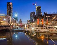 De Kraneschipbrug over de Leuvehaven in Rotterdam tijdens het blauwe uur op een koude januarimorgen, omgeven door historische schepen, met op de achtergrond de woontorens, deels in aanbouw, van het Wijnhaveneiland.