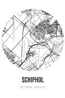 Zwart-witte landkaart, stratenplan of plattegrond van Schiphol. Schiphol is gelegen in de gemeente Haarlemmermeer, provincie Noord-Holland. Op de stadskaart zijn alle openbare wegen in Schiphol opgenomen. Verder is de kaart voorzien van de coördinaten van het centrum van Schiphol.