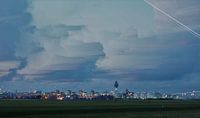 Schiphol van een afstandje op het moment dat de zon net onder is. De strepen rechts boven en onder komen van opstijgende vliegtuigen