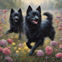 Dit levendige en grillige digitale kunstwerk vangt de vreugde van een Schipperke spelend in een veld vol wilde bloemen. De speelse uitdrukking en energieke lichaamstaal van de hond zijn perfect vastgelegd en de heldere en vrolijke kleuren van de bloemen creëren een gevoel van geluk en zorgeloos plezier.