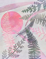 Geïnspireerd door het impressionisme presenteer ik je een prachtig botanisch natuurschilderij van bladeren en bloemen met pastelkleurige vormen en zon op een crème-beige achtergrond.