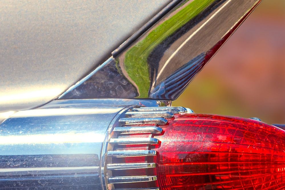 Een iconische, verchroomde staartvin van een klassieke Amerikaanse auto die het ontwerp en optimisme van de late jaren 50 weergeeft. Het felrode raketachterlicht contrasteert met het glanzende zilver en de onscherpe achtergrond.
