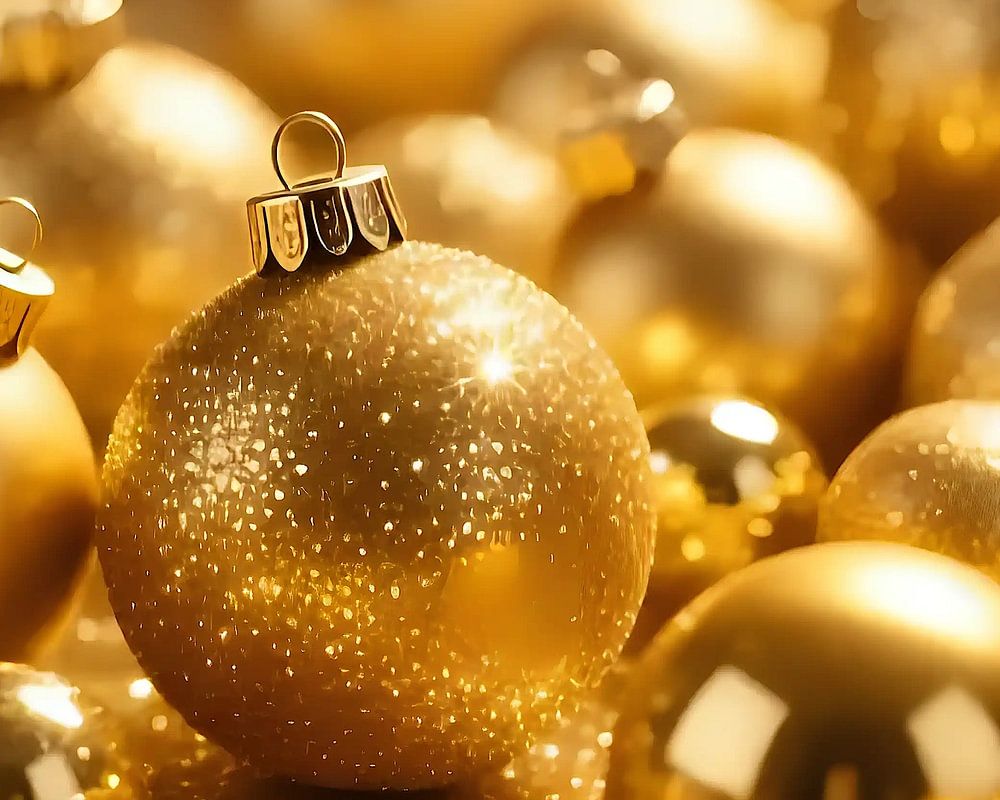 Het beeld ontvouwt een weelderige, bijna overweldigende feestelijkheid: elke centimeter van het tafereel is bedekt met oogverblindende kerstballen en fonkelende sterren, zodat het oog wordt ondergedompeld in een zee van versieringen. Ballen in alle denkbare kleuren - diep robijnrood, weelderig dennengroen, warm goud, koel zilver en stralend blauw - liggen dicht bij elkaar of hangen aan delicate draden en weerkaatsen het licht in meerdere, verspringende hoogtepunten. Daartussen zweven sterren van metaal en papier, sommige plat en filigraan, andere driedimensionaal en bestrooid met glitter; hun geometrische randen werpen delicate schaduwen en breken het licht in fonkelende fragmenten. Hun geometrische randen werpen delicate schaduwen en breken het licht in fonkelende fragmenten. Tussen de ornamenten zitten delicate strikken, parelsnoeren en kleine strengen klatergoud, die extra schaduwen en textuur creëren.