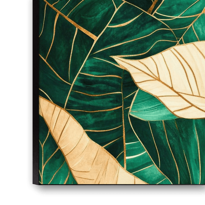 Betoverend gebladerte ontvouwt zich in weelderig groen en warme goudtinten. De fijne nerven van de bladeren geven de compositie een levendige dynamiek. Zachte rondingen en harmonieuze kleurencombinaties nodigen je uit om je onder te dompelen in een tropische oase waar de natuur schittert in al haar glorie. Een harmonieus spel van licht en schaduw brengt de kijker in verrukking.
