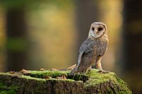 Barn Owl / Schleiereule ( Tyto alba ), adult, backside view, sitting on a tree stub in nice surrounding colours, turning its head back, Europe.