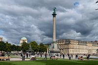Stuttgart Baden Württemberg Germany Schlossplatz column Jubilaeumsaule. Neues Schloss and dramatic clouds. bw,