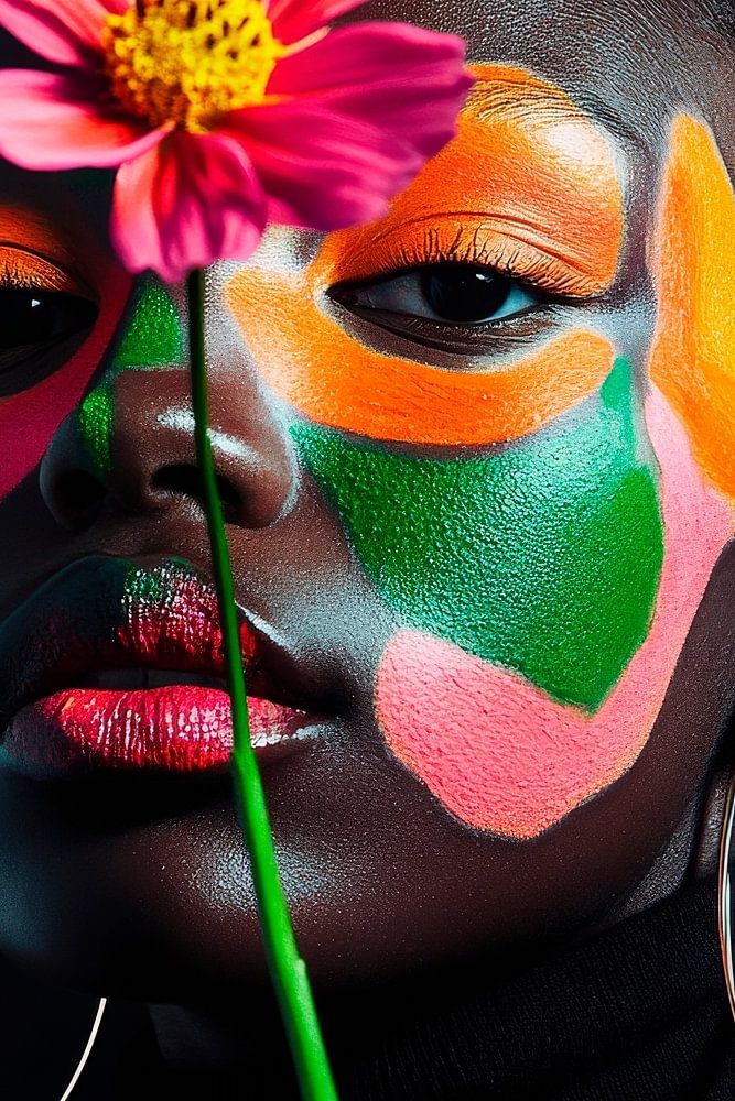 Een fascinerend portret dat de samensmelting van mens en natuur viert. De felle kleuren op het gezicht voegen levendige accenten toe, terwijl de delicate bloem en het blad een harmonieuze verbinding met de natuur creëren. Dit kunstwerk brengt frisheid en creativiteit in de woonkamer, ideaal voor een levendig gespreksonderwerp en…