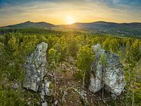Schnarcherklippen - een granieten rotsformatie met twee torens bij Schierke in het Harzgebergte, Duitsland - gefotografeerd bij zonsondergang
