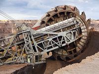 Het emmerwiel van een bruinkoolgraafmachine in de Garzweiler bruinkoolmijn van dichtbij gezien.