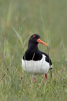 Scholekster ( Haematopus ostralegus ) in typische omgeving van een nat weiland, omhoog kijkend naar de lucht, controleren of er gevaar dreigt, grappig, tegelijkertijd typisch beeld van de opvallende en bekende steltloper, fauna, Europa.