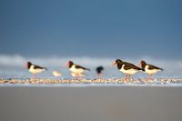 Scholeksters aan de vloedlijn op het strand van Ameland. Ze staan tussen de aangespoelde schelpen, lekker voedsel voor hen. Ik lig op m'n buik om deze vogels op ooghoogte te fotograferen.