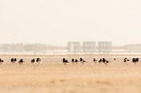 Scholeksters op het wad bij Schiermonnikoog. Bij eb staat de Waddenzee deels droog. Dan vinden veel vogels voedsel in het vochtige zand. Op de achtergrond de sluizen van Lauwersoog op het vasteland. Door de opwarming ontstaat aan de horizon een luchtspiegeling.