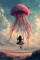 Een schilderij met een zachte, minimalistische achtergrond: een uitgestrekte woestijn, warm en stil, met een horizon die haast in de lucht oplost. In het midden van dit lege landschap, zweeft een grote kwal door de lucht. Zijn tentakels golven langzaam omlaag, en daaraan bungelt een schommel. Op de schommel zit een meisje, alsof ze zweeft tussen werkelijkheid en droom.