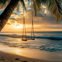 Stralen zonlicht breken door de wolken en glinsteren op de zachte golven van de zee. Een eenzame schommel, zachtjes wiegend in de wind, nodigt uit tot dromerige momenten. Palmbomen wiegen op het ritme van de natuur, terwijl het strand fijne voetafdrukken achterlaat in het warme zand. Een paradijs van rust en retraite.
