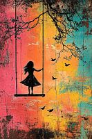 Een sfeervolle digitale illustratie waarin een meisjessilhouet op een schommel tegen een levendige achtergrond van roze, oranje en turquoise kleuren zweeft. Omringd door vogels en takken creëert het beeld een dromerige, nostalgische sfeer die speelsheid en vrijheid uitstraalt. De verweerde texturen en spatten geven het werk een eigentijdse, artistieke uitstraling.