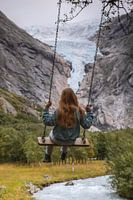 een meisje rockt voor de Briksdalsbreen gletsjer in Noorwegen