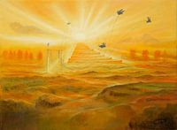 Dit schilderij toont een surrealistische en symbolische scène die de verbeelding van de kijker uitdaagt. Het middelpunt is een trap die naar de hemel leidt, waar schommelende figuren te zien zijn. De schommelende mensen zijn afgebeeld in een grijstint, wat ze variabel maakt. Ze kunnen mensen, emoties of toestanden voorstellen en hun…