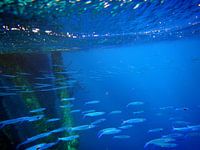 School met vis in het blauw, Zoutpier Bonaire 2018, Naaldvisachtige vis die naar open zee zwemmen