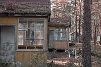 Deze houten huisjes staan op een kamp terrein voor schoolkinderen in een bos vlakbij de kerncentrale van Chernobyl en de verlaten stad Pripyat.