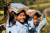 Schoolmeisjes die boeken op hun hoofd dragen in Nepal