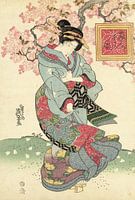 Vrouw in kimono met bloempatronen, staand in de wind onder een kersenbloesemtak; op de grond afgewaaide blaadjes. (bijinga)